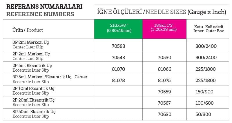 • Merkezi luer veya eksantrik luer uçlu