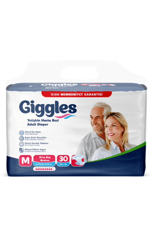 Giggles Yetişkin Hasta Bezi orta boy (M) beden ölçüsüne (85–125 cm) uygundur. Tekstil dış yüzeyi sayesinde cilde yumuşak bir his verir, hava alabilen yapısıyla uzun süreli kullanımda konfor sağlar. Süper emici tanecikleri sıvıyı hızlıca emer, ekstra kuruluk tabakası ile cildi kuru tutar.
